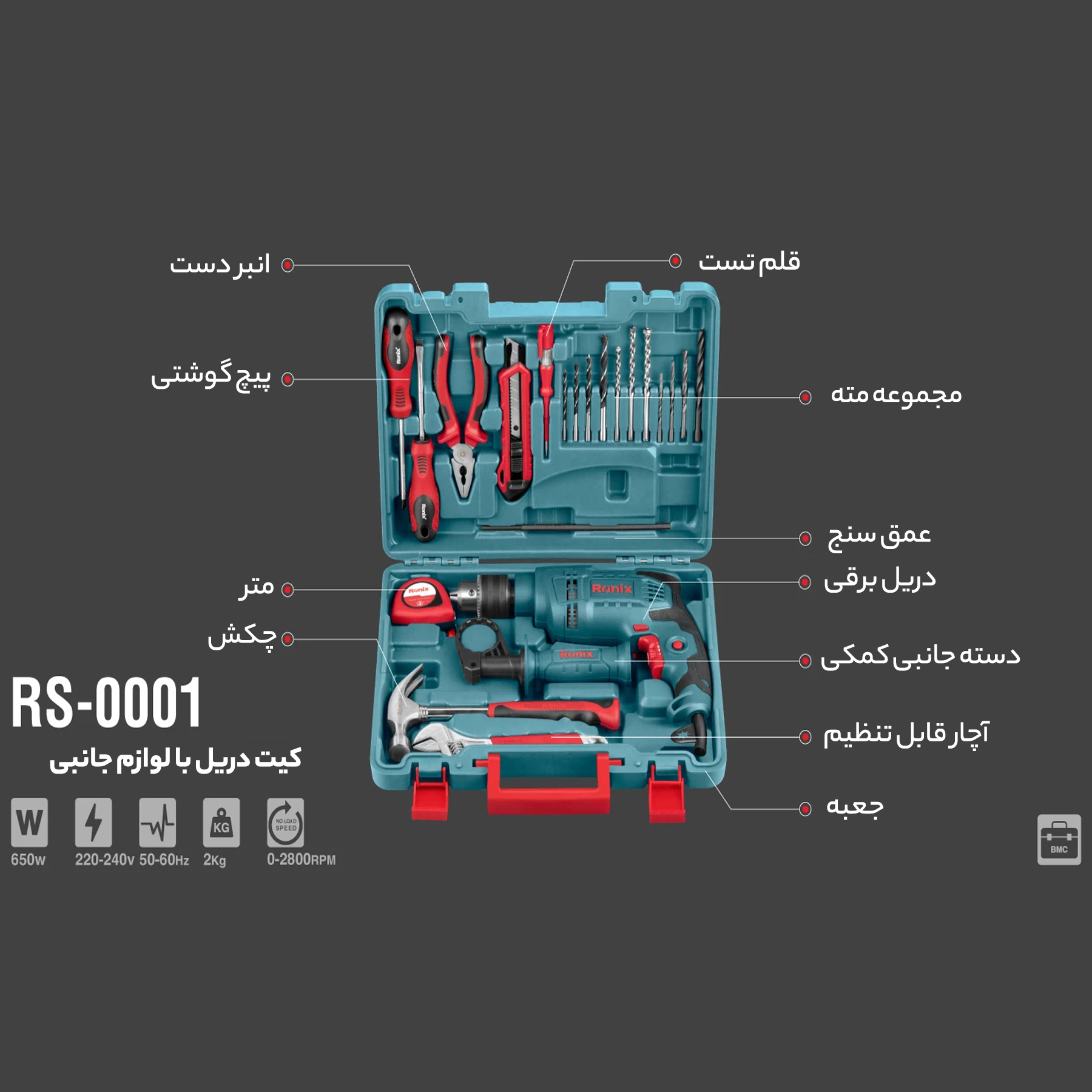 دریل چکشی RS-0001 رونیکس شامل کیت کاملی از انواع مختلف ابزارهای دستی به علاوه سری مته های رونیکس با سایز متفاوت است که در داخل کیف ضد ضربه BMC بسته بندی شده است. این دریل مجهز به موتور 650 واتی بسیار مقاوم برای بهترین کارایی در سوراخ کاری و دریل کاری چکشی می باشد که می تواند سرعتی بالغ بر 2800 دور در دقیقه ایجاد کند.